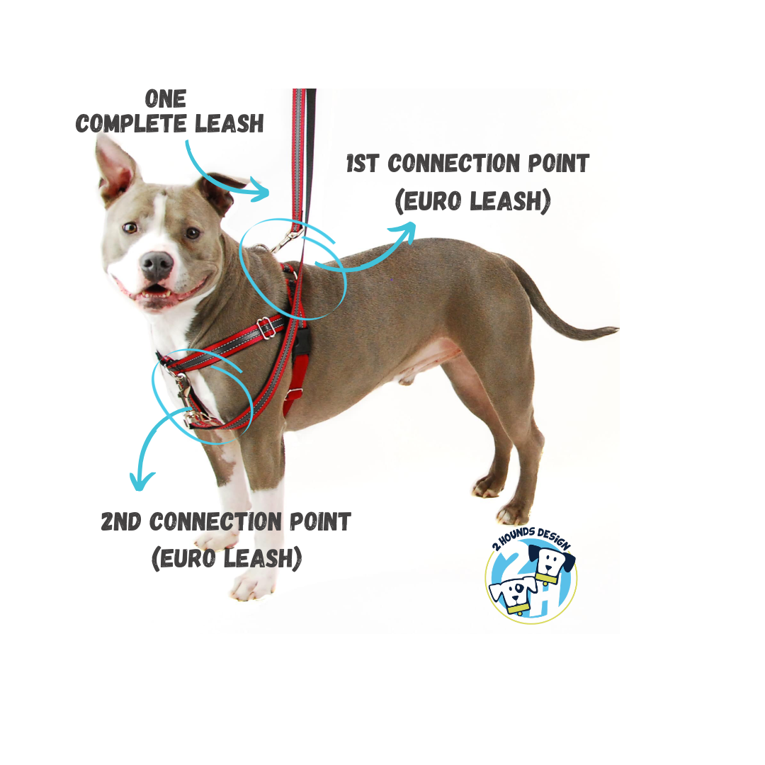 Description for Euro Leash - The Euro leash has a detachable handle and was developed to work in combination with the patented FREEDOM Harness as a front / rear control. When connected to two points, the Euro leash is 5′ long including the detachable handle and 8′ long when attached to a single point.